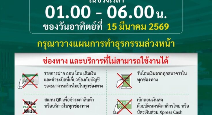 วันที่ 10 มีนาคม 2569 เพจ KBank Live ของธนาคารกสิกรไทย ประกาศแจ้งลูกค้าเกี่ยวกับการปิดให้บริการบางระบบชั่วคราว เพื่อดำเนินการพัฒนาระบบให้มีประสิทธิภาพมากยิ่งขึ้น โดยจะมีผลตั้งแต่เวลา 01:00 – 06:00 น. ของวันที่ 15 มีนาคม 2569