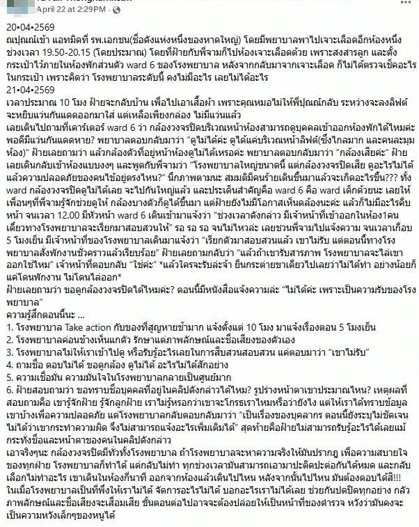 ความรู้สึกตอนนี้นะ … 1. โรงพยาบาล Take action กับของที่สูญหายช้ามาก แจ้งตั้งแต่ 10 โมง มาแจ้งเรื่องตอน 5 โมงเย็น 2. โรงพยาบาลค่อนข้างเห็นแกตัว รักษาแต่ภาพลักษณ์และชื่อเสียงของตัวเอง 3. โรงพยาบาลไม่ให้เราเข้าไปดู หรือรับรู้อะไรเลยในการสืบสวนสอบสวน แค่ตอบมาว่า “เขาไม่รับ” 4. ถามชื่อ ตอบไม่ได้ ขอดูกล้อง ดูไม่ได้ อะไรไม่ได้สักอย่าง 5. ความเชื่อมั่น ความมั่นใจในโรงพยาบาลกลายเป็นศูนย์มาก 6. ฝ้ายสอบถามว่า ขอทราบชื่อบุคคลที่อยู่ในคลิปดังกล่าวได้ไหม? รูปร่างหน้าตาเขา